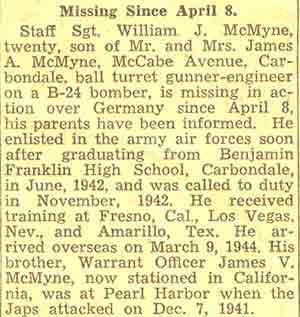 Somerville Radio Operator David G. Somerville did not survive. Nor did Pilot Harry E. Sturdevant, Co-Pilot William E. Williams, Navigator Raymond Zielinski, Engineer Noble F. Garner, Left Waist Gunner, Harry R. Rohne, Right Waist Gunner Perry J. Snyder, or Tail Gunner Gene Gardner. All were lost. Only Bombardier Thomas M. Twisdale survived with my father.